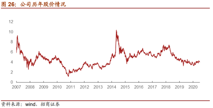 从2019年初开始,公司PE持续走低,截至6月4日,PETTM为3.2倍,位于10年来的1%分位左右,达到历史底部。再看公司A/H股比价,截至6月4日,公司A/H股溢价率为59.37%,达到10年来的69%分位以上。2020年股息率大概在6%。公司估值持续走低的原因既有对行业的悲观预期,也有短期的事件催化,我们认为目前无需特别悲观。另外,我们选取公司估值50%以下、换手率在3%以上的区间分析,6次中有3次年内涨幅较大。