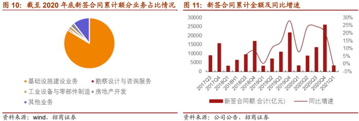 公司2020年新签订单共26056.6亿元,同增20.4%。其中基建建设业务新依然是推动公司订单快速增长的主要因素。受益于投资项目的拉动,新签铁路、公路与市政及其他业务订单分别同比增长14.2%、32.6%与20.7%,总体保持强劲的增长态势。公司截至2020年末在手订单3.73万亿元,在手订单收入比为3.82,较为充沛。未来公司铁路订单将受益于川藏铁路项目,预计订单增速将继续保持稳健增长态势。未来公司在保持城市轨道交通及市政工程建设市场现有优势的同时,还将陆续向港口、机场和环保项目等新的建设领域进行拓展。今年一季度订单增速小幅下滑2.5%。