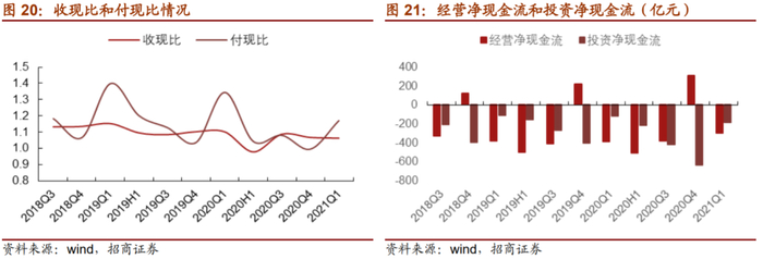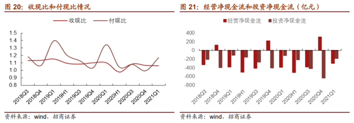 公司计提资产减值与信用减值损失80.54亿元,较去年同期增加20.20亿元,主因部分项目计提了存货跌价损失。综合来看,公司2020年实现归母净利润251.88亿元,同增6.38%,在19年有较多非经常性损益的情况下仍实现了目标增长。2021年一季度公司实现归母净利润64.85亿元,同比增长80.89%。
