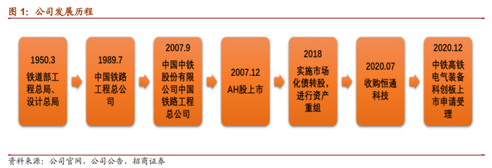 中国中铁拥有一百多年的历史源流。1950年3月,公司为当时的中国铁道部工程总局和设计总局,后变更为铁道部基本建设总局。1989年7月,经国务院批准撤销基本建设总局,组建中国铁路工程总公司。2000年9月,与铁道部实行政企分开,整体移交中央大型企业工作委员会管理。2003年5月由国务院国资委履行出资人职能。2007年9月12日,中国铁路工程总公司独家发起设立中国中铁股份有限公司,并于2007年12月3日和12月7日,分别在上海证券交易所和香港联合交易所上市。2017年12月由全民所有制企改制为国有独资公司,更名为中国铁路工程集团有限公司。