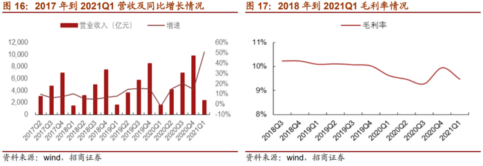 2020年公司实现营收9748亿元,同比增长14.6%,下半年基本摆脱疫情带来的影响。其中,国家保增长政策下市政、公路和设备制造业务的增长尤为亮眼,分别同增23.2%、24.3%、35.9%。2021年一季度由于低基数的原因,收入同比增长50.9%。