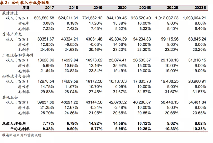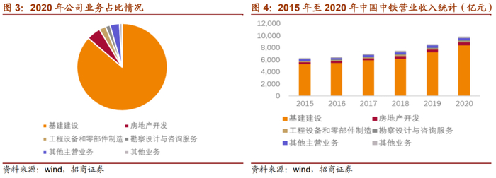 公司2020年营业总收入9747.49亿元,从营业收入构成来看,2020年公司基建建设业务收入占营业总收入的86.6%,房地产开发业务占营业总收入的5.1%,工程设备和零部件制造业务占总收入的2.4%,勘察设计与咨询服务占总收入1.7%,其他主营业务占总收入3.4%,其他业务占收入0.9%,可见公司的主要业务以基建为主。