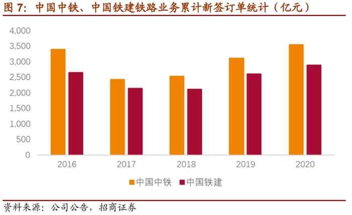 公司2020年新签订单共26056.6亿元,同增20.4%。其中基建建设业务新依然是推动公司订单快速增长的主要因素。受益于投资项目的拉动,新签铁路、公路与市政及其他业务订单分别同比增长14.2%、32.6%与20.7%。公司截至2020年末在手订单3.73万亿元,在手订单收入比为3.82,较为充沛。国内方面,公司目前继续拓展房地产开发及基建投资运营等相关业务,房地产开发重点主要为旧城改造、新城及新城区建设以及土地开发,积极涉足装配式建筑等新领域业务;海外方面,借助一带一路,稳步把握新的海外市场建设机会。