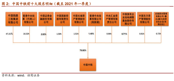 公司股权较为集中,第一大股东中国铁路工程集团有限公司持股47.21%。第二大股东香港中央结算(代理人)有限公司(即在香港上市部分)持有中国中铁股份16.32%。前十大股东共同控制企业73.92%的股份。公司的实际控制人为国务院国有资产监督管理委员会。整体来看公司的股权结构较为稳定。