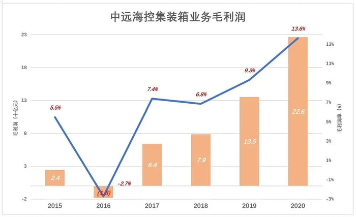 2017年,中远海控实现毛利润64亿、毛利润率7.4%;2019年毛利润135亿、毛利润率9.3%;2020年毛利润226亿、毛利润率13.6%。