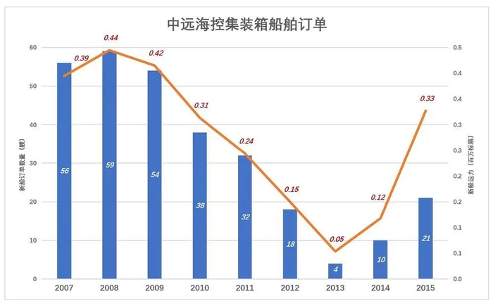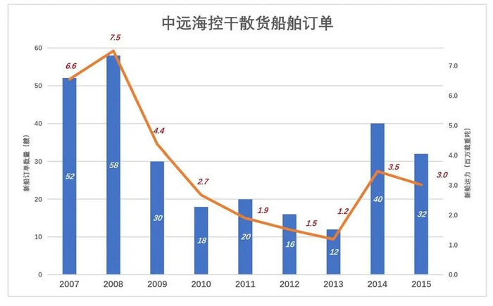 2007年末,在“全球干散货业务呈现强劲增长态势”这样的判断下,中国远洋持有新船订单52艘,载重吨655万吨。