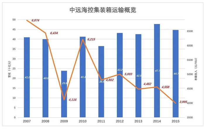 2007年,每运输一个标准集装箱的平均收入为6874元;2009年跌至4116元,2010年反弹至6215元后震荡下行,2015年跌破4000元。