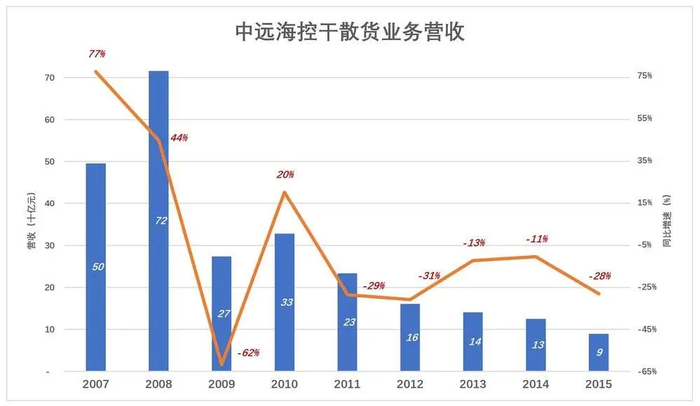 并购头两年,干散货业务营收涨势喜人:2007年收入496亿、同比增长76.8%;2008年收入进一步增至716亿、同比增长44.3%。