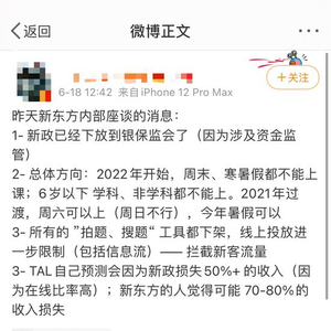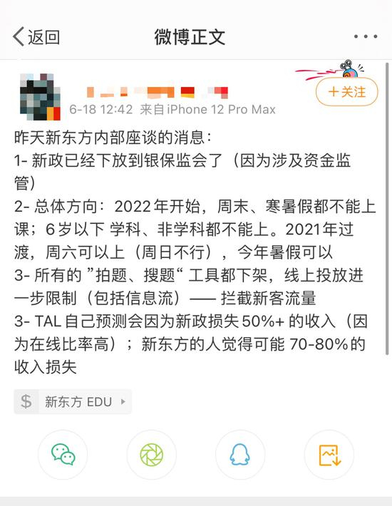 校外培训监管趋严,市场人心惶惶,流言频出。“昨天新东方内部座谈,(针对校外培训机构的)新政已下放到银保监会。”6月18日中午,微博上某财经博主发布上述消息。