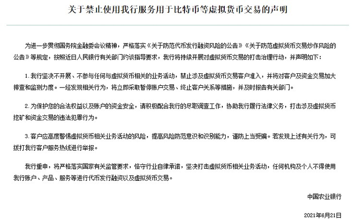 6月21日,中国农业银行(01288)发布《关于禁止使用我行服务用于比特币等虚拟货币交易的声明》,声明称,该行坚决不开展、不参与任何与虚拟货币相关的业务活动,禁止涉及虚拟货币交易客户准入,并将对客户及资金交易加大排查和监测力度。一经发现相关行为,将立即采取暂停账户交易、终止客户关系等措施,并及时报告有关部门。
