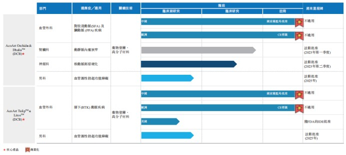 其中,AcoArt Orchid® & DhaliaTM是一种紫杉醇DCB,适用于股浅动脉(SFA)及腘动脉(PPA)病变,于2016年5月获国家药监局批准,比第二款获批的同类产品领先大概四年的时间。截至2021年5月27日,公司已在中国推出AcoArt Orchid® & DhaliaTM,并已在十一个其他国家推出AcoArtOrchid®,包括德国、意大利及瑞士等医疗技术先进的国家。于2019年及2020年,AcoArt Orchid® & DhaliaTM于中国及海外的销售所得收入的收益分别为1.20亿元及1.87亿元。