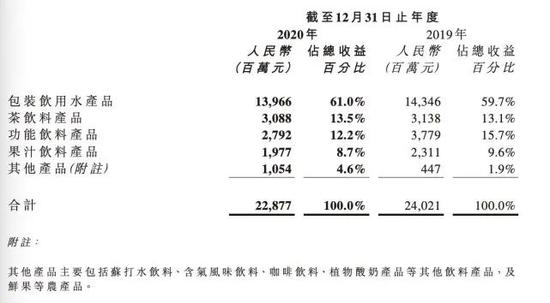 财报显示,2020年,农夫山泉包装水、茶饮料、功能饮料、果汁饮料均出现了营收下滑的情况。