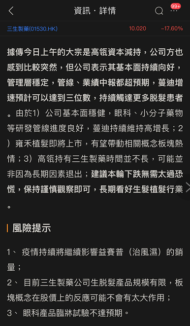 同时,也有市场人士认为,也可能是中信证券。新浪港股查询发现,中信证券持股公司18.56%,持有4.722亿股,为公司第二大股东。同时,中信证券也是港股即将上市的植发第一股雍禾医疗的实控人,而三生制药的产品蔓迪正是治疗男性脱发的,那中信证券是否有理由放弃三生制药而专攻龙头呢?