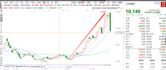 三生制药今日在香港低开低走,一度跌超18%,最终收盘跌16%,逾50亿市值蒸发,在公司暴跌背后,公司在盘前惊现3宗大宗交易,涉及2.2937亿股,每股价格11.16港元,涉资25.6亿港元。如此巨量资金抛售,引发市场剧烈恐慌。