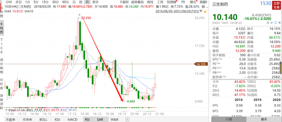 随着公司业绩下滑,公司从2018年5月底的23.25港元,一路跌到2020年3月底的6.6港元,区间跌幅高达71.6%,直到2020年3月高瓴二次入局三生制药股价才重返升浪。