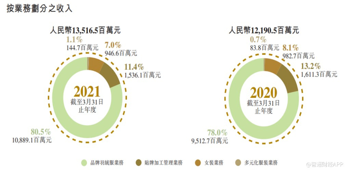 目前,波司登的业务涵盖品牌羽绒服、贴牌加工管理、女装及多元化服装,四大主营业务单元,其中品牌羽绒服业务为公司最大收入来源。2020/21财年,品牌羽绒服业务实现销售收入108.89亿元,同比上升14.5%,收入占比达到80.5%。其中,波司登主品牌收入同比上升18.9%,达99.98亿元。