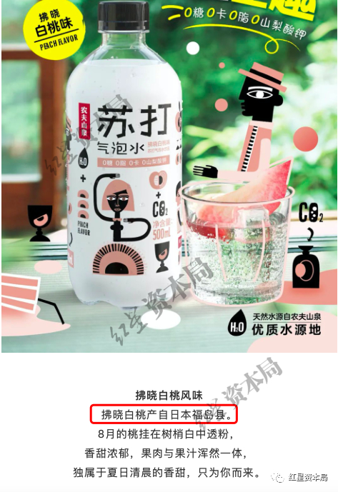 红星资本局发现,这款苏打气泡水是农夫山泉于4月1日推出的新品,一共有莫吉托、拂晓白桃、日向夏橘三种口味,这次“翻车”的广告词就源自其中一款拂晓白桃风味。