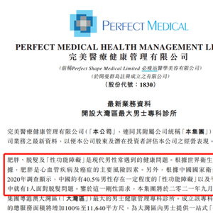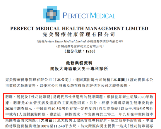 6月29日消息,港股上市公司完美医疗近期动作频频,而在其公告中更是让市场惊讶不已,根据完美医疗公告,根据中国国家卫生健康委员会2020年调查显示,中国约有40.5%男性存在一定程度的“性功能障碍”以及平均每5名男性中就有1人面对脱发问题。