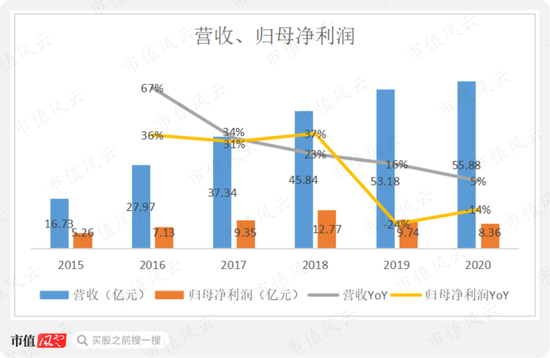 而2019年和2020年营收增速明显下滑,分别为16%和5%,归母净利润均为负增长,分别下滑24%和14%。