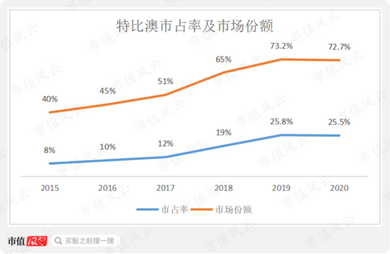 以销售量计算的市占率和以销售额计算的市场份额均不断提升,分别从2015年的8%和40%上升至2020年的25.5%和72.7%。