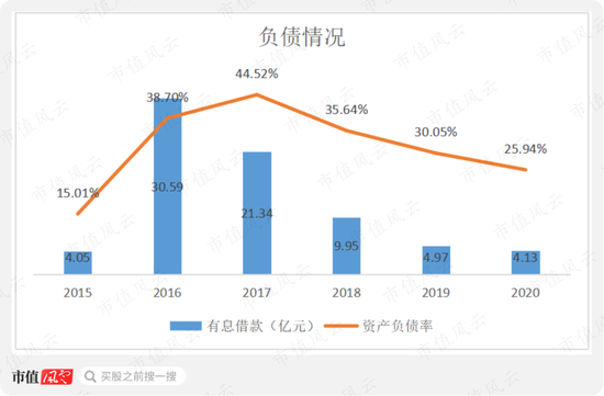 赚到了真金白银,公司账上有息负债明显减少,2020年仅4.13亿,较2016年的30.59亿有了大幅的减少,同时资产负债率也持续下降,从2017年的高点44.52%下降为25.94%。
