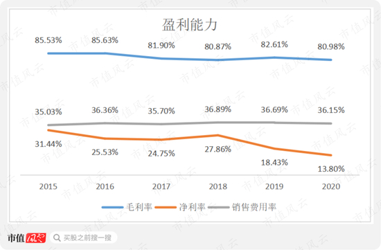 2015-20年,公司的毛利率有下滑趋势,但均维持在80%以上的较高水平。