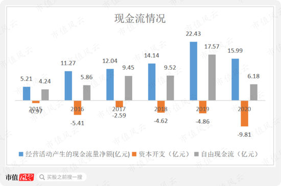 除了投资并购,公司用于资本开支的金额也在逐年增长,但公司现金流状况较好,各年净现比均大于1,自由现金流也持续为正。