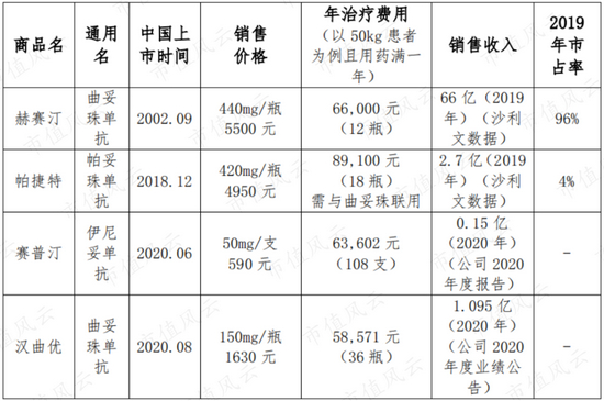 从2020年的销售情况来看,上市时间稍晚的仿制药汉曲优销售额达1.095亿,而原研药赛普汀仅0.15亿。