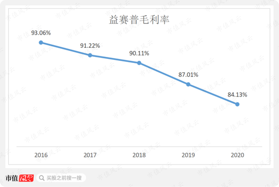 由于竞争愈加激烈,2016-19年,益赛普的毛利率不断下滑,从93.06%下降至87.01%。