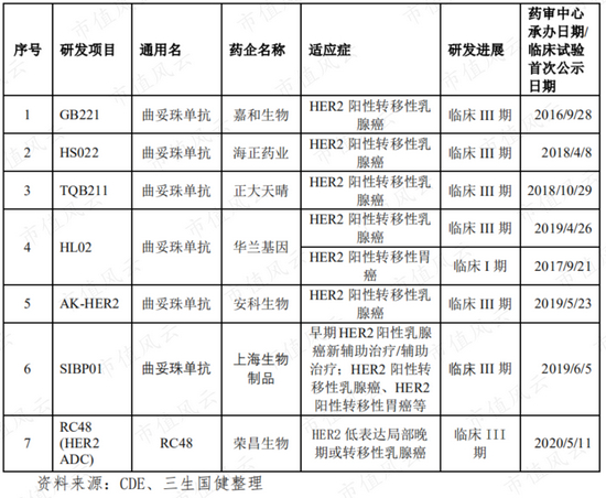 而且随着2019年罗氏赫赛汀的专利到期,也会有更多多仿制药陆续上市。截至2020年年底,进入交临床III期的产品就已经有7个。