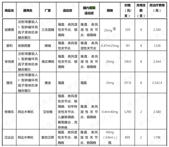 其中辉瑞的恩利和复宏汉霖(02696.HK)的汉达远月治疗费用分别为1528元和1798元,大幅低于益赛普的2560元。