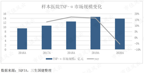 首先,2020年疫情影响使医院诊疗人次下降,相较于之前年度10%以上的增长,样本医院TNF-α 市场规模首次出现负增长,对益赛普销售收入造成较大影响。