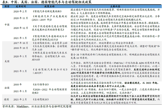 总体而言,无人驾驶商用车的落地取决于技术的成熟以及政策法规的完善。政策方面,各国纷纷推出自动驾驶技术发展战略及规划。目前来看,美国自动驾驶商业化法规配套最为完善。此外,科技公司的技术成熟也是自动驾驶商业化落地的关键,目前自动驾驶技术成熟度仍然有待提升。
