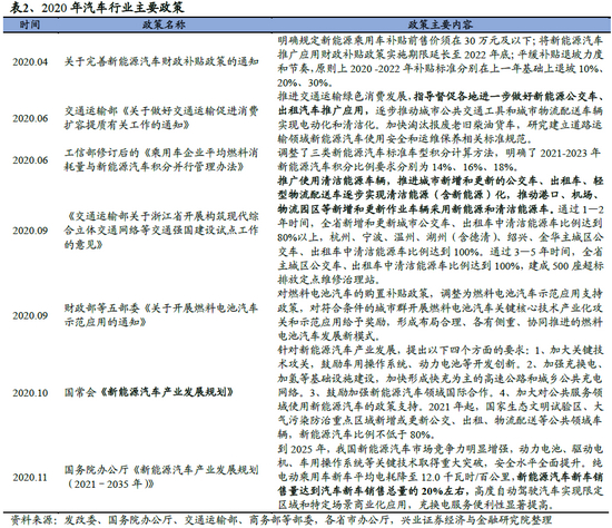 新能源进程加快,预计2020年新能源车销量占比达到20%。2020年4月,财政部、工业和信息化部、科技部及发展改革委发布了《关于完善新能源汽车推广应用财政补贴政策的通知》,提出延长补贴期限、平缓补贴退坡力度和节奏等政策。6月,工信部发布了修订后的《乘用车企业平均燃料消耗量与新能源汽车积分并行管理办法》,调整了三类新能源汽车标准车型积分计算方法,明确了2021-2023年新能源汽车积分比例要求分别为14%、16%、18%。11月,国务院办公厅正式发布了《新能源汽车产业发展规划(2021-2035年)》。《规划》提出,到2025年,我国新能源汽车新车销售量达到汽车新车销售总量的20%左右。
