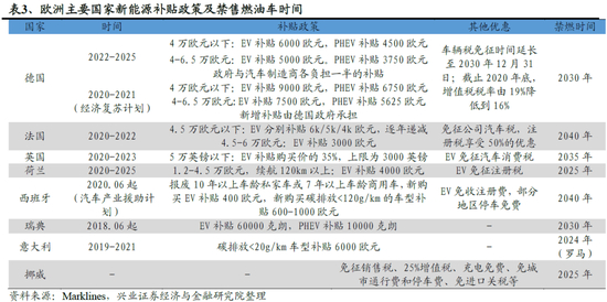 主要欧洲国家规划于2040年前禁售燃油车并制定中期过渡目标:荷兰、挪威将在2025年率先禁售燃油车,德国、瑞典、爱尔兰、瑞士为2030年,英国禁售燃油车的时间为2035年,法国、西班牙计划2040年禁售燃油车。此外,各国还制定了中期销量目标以完成向燃油车禁售的平稳过渡:法国计划2022年新能源车销量较2017年提升5倍;英国计划在2030年完成新能源新车50%的渗透率;德国计划在2022年拥有100万辆电动车保有量。