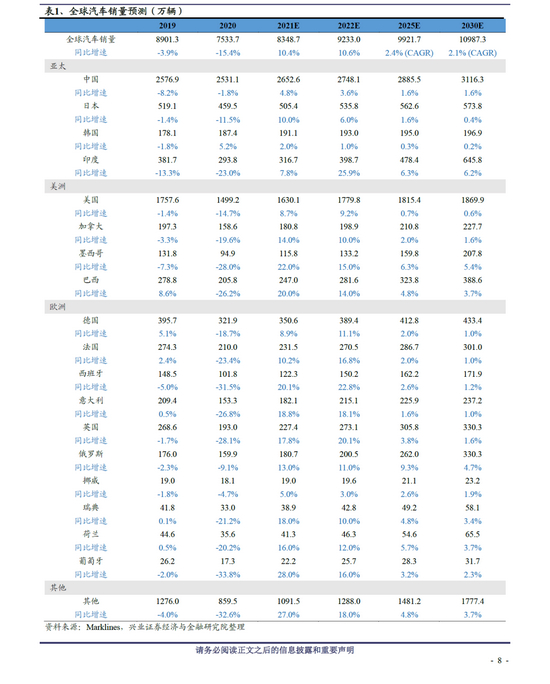 我们维持年初2021-2022年全球汽车行业将迎来恢复性增长预期,考虑到芯片短缺影响,分别下调2021年增速及上调2022年增速至10.4%和10.6%。当前,连续三年下滑导致当前我国汽车销量基数已经很低,汽车消费政策不断出台,2021年我国汽车销量有望迎来正增长,预计增速在5%左右。此外,2020年伴随疫苗逐步推广以及海外疫情得到缓解,欧美汽车行业有望快速恢复。从目前的情况来看,美国及欧洲主要国家均有望在2021-2022年实现正增长。综合来看,我们预计全球汽车销量2021年有望同比增长10.4%,2022年有望同比增长10.6%。2023-2030全球汽车销量或将进入低速增长期,预计2023-2025销量CAGR约为2.4%,2026-2020销量CAGR约为2.1%。