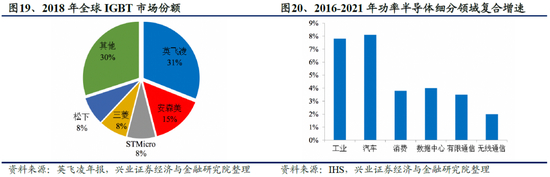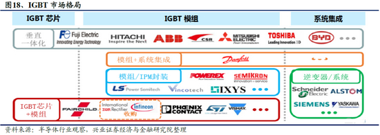 2019年全球IGBT市场规模49.1亿美元,中国市场规模约162亿人民币,但是几乎被外资垄断:中国中高端MOSFET及IGBT主流器件市场上,90%主要依赖进口,基本被国外欧美、日本企业垄断。中国车规级IGBT市场中,英飞凌在中国市场占据绝对主导地位,市场占有率达到58%;比亚迪半导体为18%,主要配套自有车辆;其他重要IDM国产厂商为斯达股份与中车时代电气,华虹半导体主要为IGBT代工,赛晶电力电子为IGBT外企分销商,同时在推进IGBT封装生产。