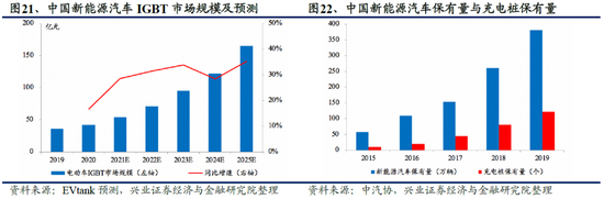 IGBT芯片国产化需求迫切,新能源汽车IGBT国产化替代空间宽广。IGBT芯片为电动汽车的电机驱动控制模块的重要部件,2019年中国新能源汽车IGBT市场规模为36亿元,伴随2025年国家政策要求新能源汽车销售占比达到25%,将会极大刺激对IGBT的需求,预计未来五年年均增速保持30%,2025年中国新能源汽车电驱IGBT市场规模可达165亿元。充电桩方面,成本为10万元的快充桩IGBT价值量约为2万元,快充桩占充电桩总数的20%。国家政策要求2025年车桩比达2.7,由此带来的IGBT需求广阔,国产化替代空间巨大。