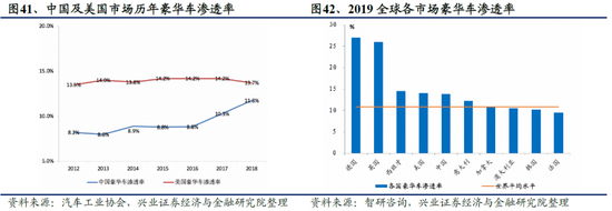 与发达国家相比,我国豪华车渗透率仍有增长空间。中国市场近年来豪华车渗透率迅速提升,2019年中国市场豪华车渗透率约为13.8%。参考先行国家,我们发现美国豪华车市场渗透率长年保持在14%左右,而德国、英国等国家渗透率均在25%以上。而我国北京、上海、浙江、江苏等地豪华车渗透率已超过20%。我们认为,我国与发达国家相比,豪华车渗透率仍有增长空间;分地区来看,低线城市豪华车市场增长潜力巨大。
