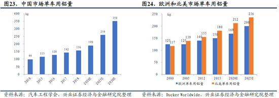 欧洲和北美市场单车用铝量正在并仍将提高。根据欧洲铝业协会与Ducker Worldwide的统计得知,欧洲市场中自1990年到2018年,单车铝合金的使用量从50kg增长到180kg,到2025年单车铝合金使用量将达到200kg;北美轻型车辆车铝材用量从2015年的180kg增长到2020年212kg,并将在2025年达到236kg。