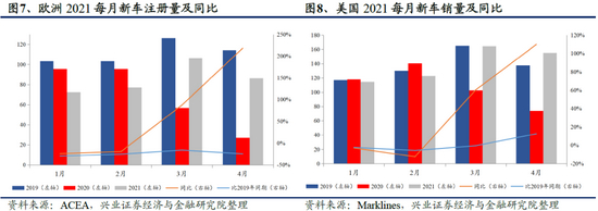 欧美汽车需求仍在快速恢复。3月和4月,美国新车销量达到164.5/155.1万辆,实现同比增长60.3%/109.8%;1-4月,美国新车销量达到557.1万辆,同比增长11.1%,与2019年同期相比增长1.2%。3月和4月,欧洲新车注册量分别达到106.2/86.2万辆,同比增长87.3%/218.6%;1-4月, 欧洲累计新车注册量为342.3万辆,同比增长24.4%,与2019年同期相比下降23.5%。由于基数低,同比有大幅增长趋势,但仍未恢复到2019年水平。