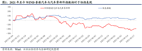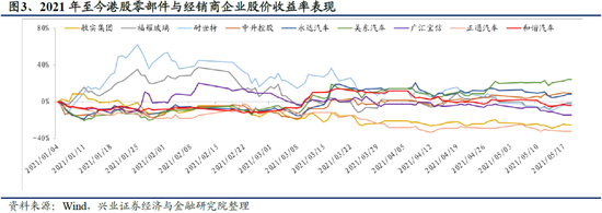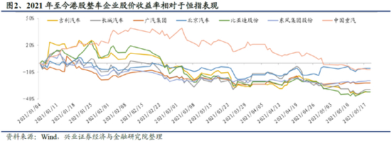 2021年初至今,汽车行业受芯片短缺及原材料涨价影响,板块整体承压,Wind香港汽车与汽车零部件指数收益率低于恒生指数。年初至5月20日,Wind香港汽车与汽车零部件指数收益率为-19.0%,同期恒生指数收益率为4.1%。板块整体表现自二月开始弱于恒生指数,主要是受到芯片短缺带来的整车厂产能削减以及原材料涨价带来的成本压力双重影响,行业产销及盈利能力恢复不及预期。