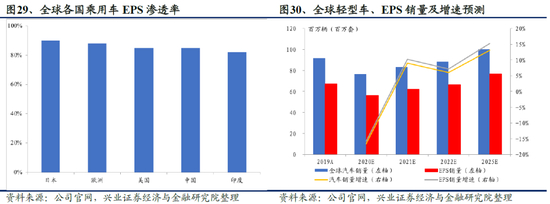 新兴市场乘用车EPS渗透率仍有提升空间,短期需求有望迎来恢复性增长:欧美市场作为成熟汽车市场,乘用车EPS渗透率在85%~90%。中国市场2019年EPS出货量约为1800万套,乘用车EPS渗透率已超过80%。相比欧美等成熟市场,中国、印度、巴西等新兴市场EPS渗透率仍有5%~10%的提升空间。2020年全球轻型汽车销量同比减少15%。由于全球主要汽车市场的复苏,预计2021年全球新轻型车销量为8340万辆,较2020年增长9%。此外,基于2022年有效疫苗有望在全球广泛接种的假设,预计2022年全球汽车销量将进一步恢复,同比增速约为6%。伴随全球汽车销量恢复以及EPS渗透率小幅提升,我们预计2021-2022年全球电动助力转向系统出货量有望同比分别增长10%、7%。
