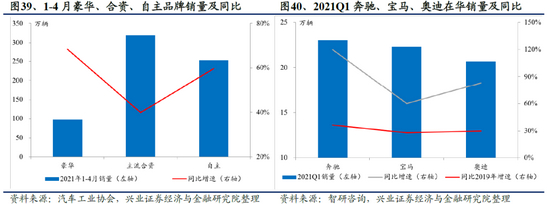 2021年主流豪华品牌表现仍大幅优于乘用车整体。根据乘联会数据,2021年1-4月,国内十大豪华品牌经销商终端零售约为98万辆,同比增长约68.3%,增速高于乘用车整体约17.6个百分点,豪华车渗透率约为14.4%。奔驰/宝马/奥迪分别在华交付新车23.0万辆、22.3万辆和20.7万辆,同比2020年分别增长120.0%、60.1%、83%,同比2019年分别增长36.4%、27.9%、29.9%。