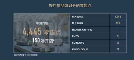 过去几年香港市场持续疲软,周大福对中国内地市场日益倚重,再加上老凤祥、六福等品牌利用加盟模式快速占领市场,周大福也利用加盟模式加快渗透低线城市。截止到2021年3月,周大福在中国内地有4445个零售点,香港和澳门有100个,其他地区有46个零售点。