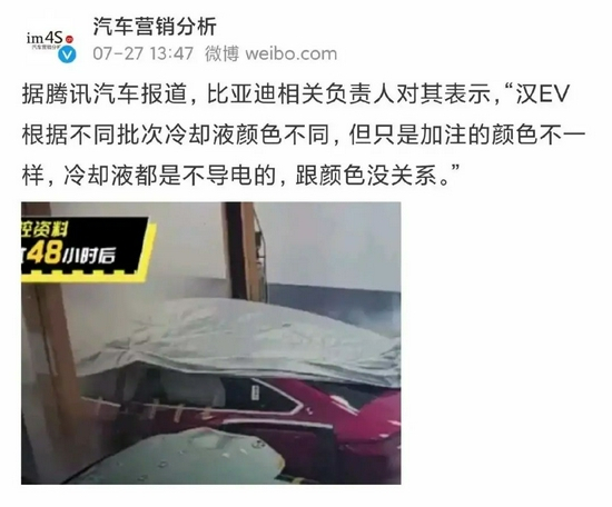 今天上午,比亚迪相关负责人又表示,不同批次冷却液颜色不同,但都是不导电的。