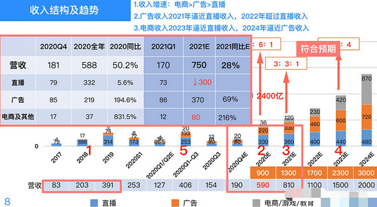 所以,只能理解为快手谋求转型的业务“变阵”——2020年之前,快手以直播收入为主,广告收入、电商收入为辅;2020Q4之后,广告成为快手最大的收入来源,直播第二,电商等其他收入位列第三。