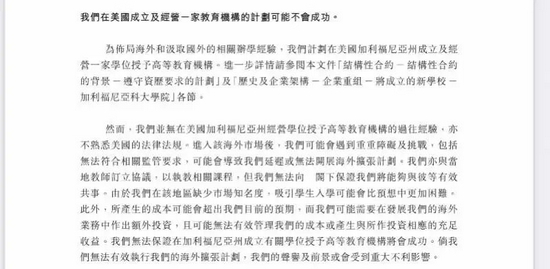 不过最新这份招股书中,其又表示:在美国成立及经营一家教育机构的计划可能不会成功。因其并无过往经验,亦不熟悉美国的法律法规。再加上缺少市场知名度、成本可能会超出目前的预期,所以可能无法有效执行海外扩张计划,且带来声誉及前景或会受到重大不利影响。
