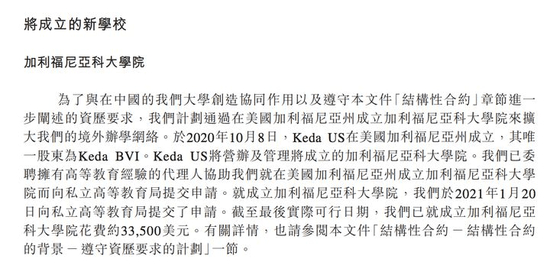 有趣的是,在1月份中国景大教育集团谋求上市时,还提到计划在美国设立一所学校。根据招股书显示,其于2020年10月8日在美国加利福尼亚州成立Keda US,负责成立加利福尼亚科大学院事项。2021年1月20日,Keda US向私立高等教育局提交了申请。且其称当时已就成立加利福尼亚科大学院花费约3.35万美元。