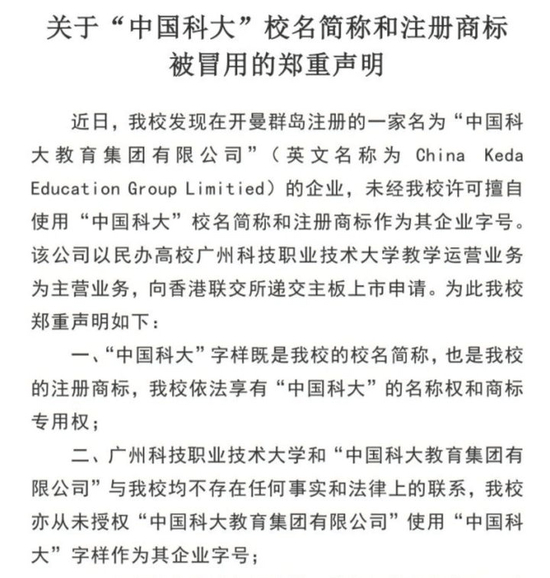 中国科学技术大学在声明中表示,这家在开曼群岛注册的名为“中国科大教育集团有限公司”的企业,未经该校许可擅自使用“中国科大”校名简称和注册商标作为其企业字号。中科大强调称,“中国科大”字样既是该校校名简称,也是该校注册商标,中科大依法享有“中国科大”的名称权和商标专用权,该校从未授权“中国科大教育集团有限公司”使用“中国科大”字样作为其企业字号。